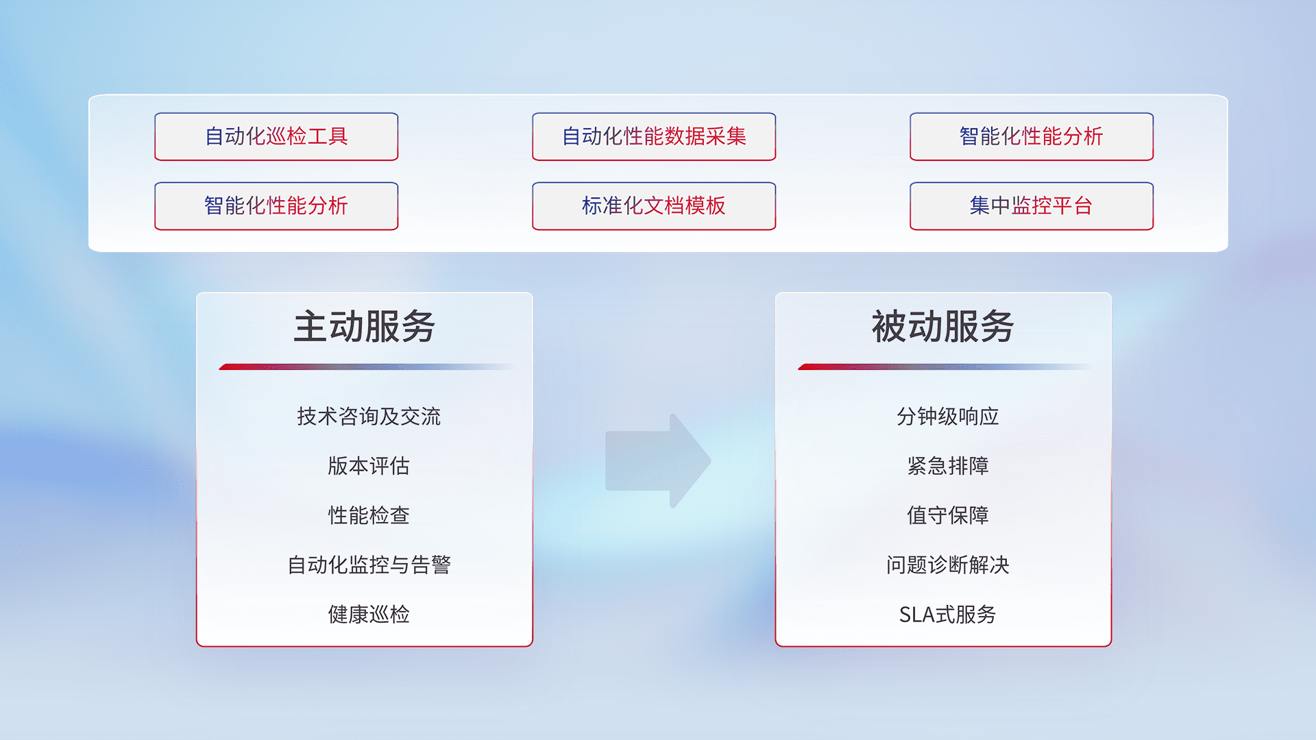 智能化工具和标准化文档,,保障服务质量,,提供主动服务(包含技术咨询、、版本评估、、、性能检查、、自动化监控与告警、、、健康巡检)和被动服务包含(分钟级响应、、、紧急排障、、、、值守保障、、问题诊断解决、、、SLA服务)。。