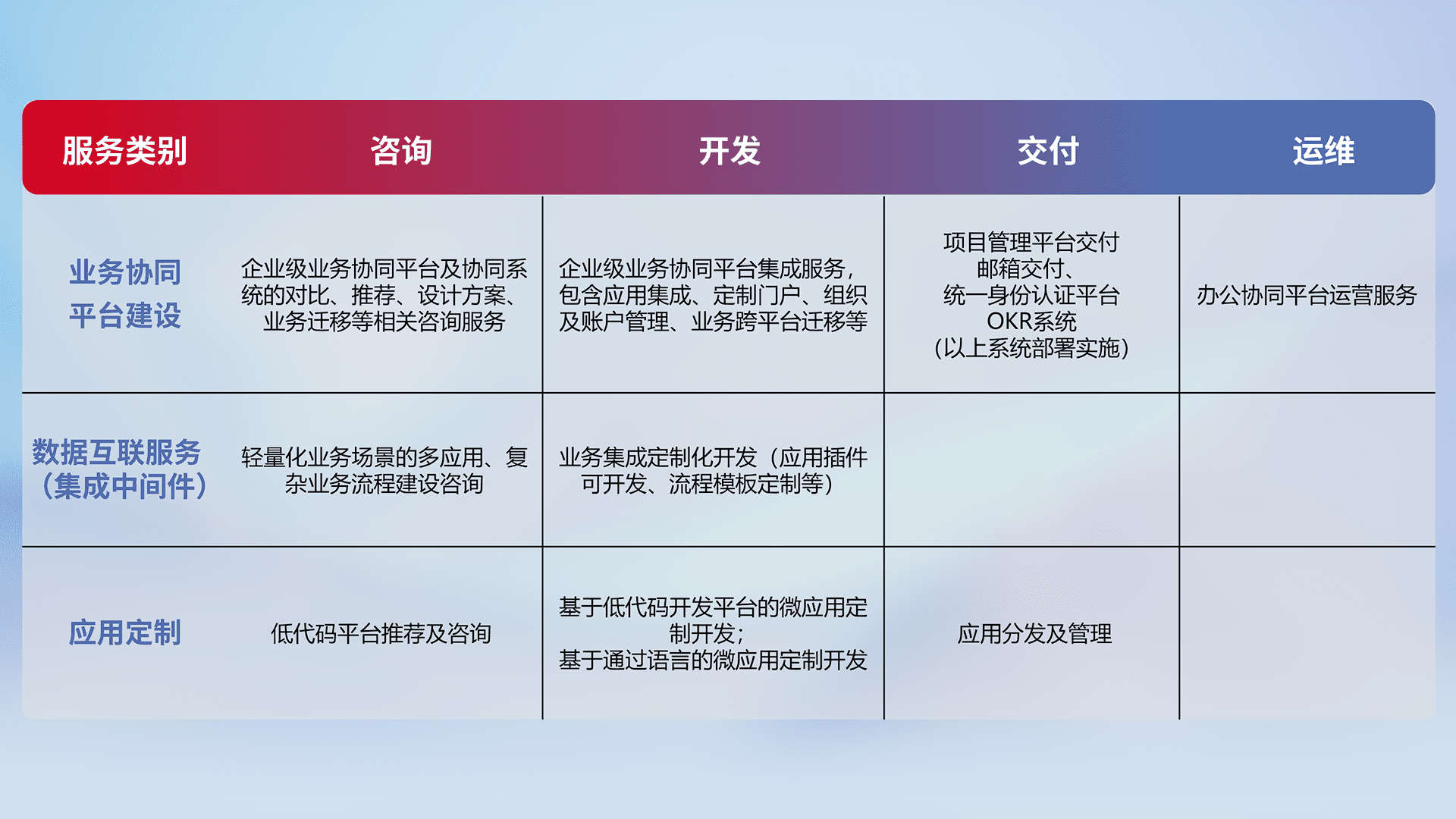针对钉钉、、、企微、、、IDaas等平台级产品提供产品的规划、、、、方案、、、、交付、、、、定制化开发等服务,,,实现如统一协同办公、、、、智能客户服务、、、混合会议管理、、智能数据查询、、、等业务场景,,实现数字化转型。。。